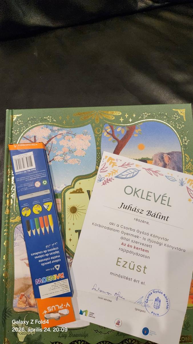Juhász Bálint negyedik osztályos tanulónk a Csorba Győző Könyvtár Körbirodalom Gyermek- és Ifjúsági Könyvtára által szervezett Az én kertem rajzpályázaton ezüst minősítést ért el.